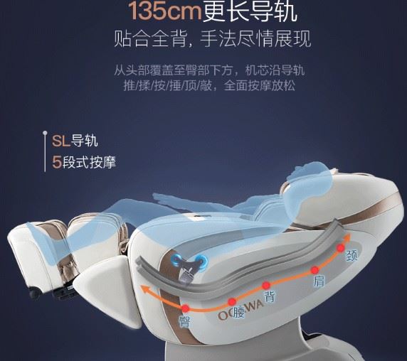 采用135cmSL型导轨,按摩行程从头颈覆盖至臀部下方,提供颈肩腰背臀5段式按摩。