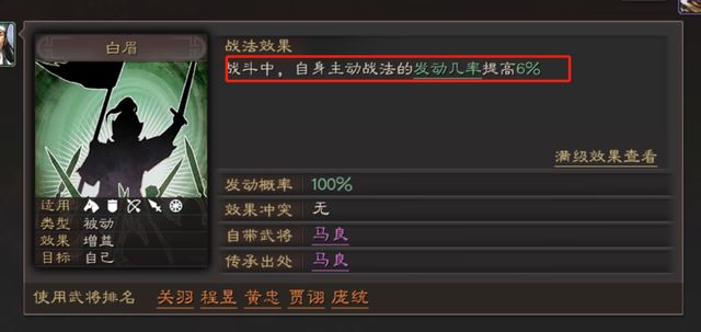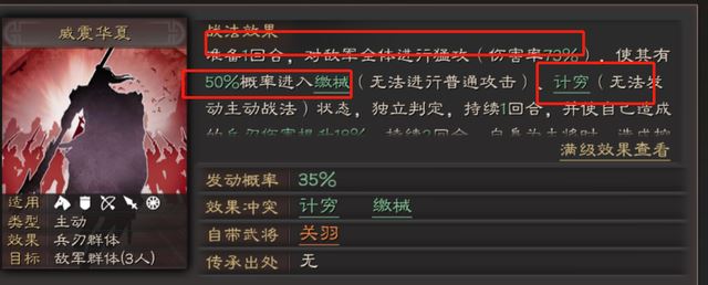 关羽队伍的控制,其次补个伤害,这个战法属于比较常见的带法,白眉+纵兵劫掠,让诸葛带八门,关羽有给先手控制,在配合兵书速战,提高自身速度,通过白眉带来的主动战法触发效果,让自带战法和纵兵劫掠的效果可以更好的打出来,避免出现被演的情况,作为主将还可以让自带的控制效果的几率达到65%以上。
