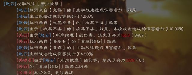 赵云是队伍的输出,主战免疫控制,选在速度上会比关羽快一些,可以让关羽的输出得到一定提升。战法选择破阵摧坚+所向披靡,破阵摧坚可以大幅度降低对方的双属性,降低法师伤害,配合披靡加兵书将威鬼谋提高伤害很容易打出非常高爆发,