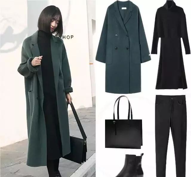 其实生活中有很多人都对墨绿色不太感兴趣,觉的穿在身上会不会显的老气,其实这种略深的绿色,肤色不太深的人穿起来都特别的抬气质还显白。这件墨绿色的大衣简约的设计搭配黑色高领收腰针织长裙,不仅时髦还特别的知性,打底裤和短靴的搭配洋溢着成熟女性的干练气质。