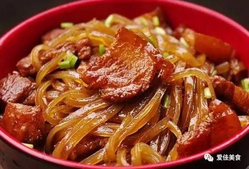 食材准备:猪肉400克、红薯粉条150克、葱1根、八角2颗、冰糖8克、姜片3片、生抽2大匙、盐1/2小匙、老抽1小匙、花雕酒1小匙