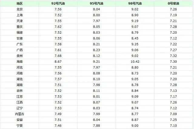 北京调整后92号汽油新价格7.56元/升;北京调整后95号汽油新价格8.04元/升;北京调整后98号汽油新价格9.02元/升;北京调整后0号柴油新价格7.26元/升。
