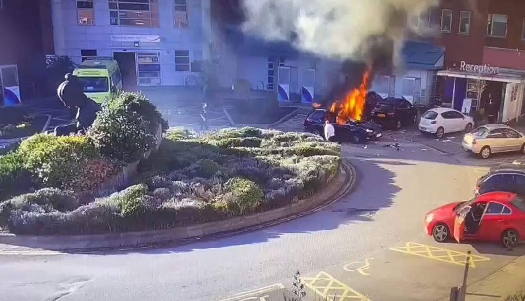 一段医院停车场的监控录像显示,当时这辆深色出租车快速驶入医院停车场,但它在停稳前就发生了爆炸。