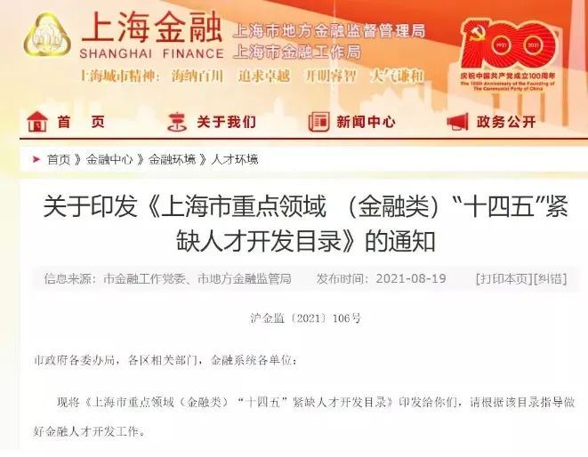 2021年8月19日,上海市地方金融监督管理局印发《上海市重点领域 (金融类)“十四五”紧缺人才开发目录》。