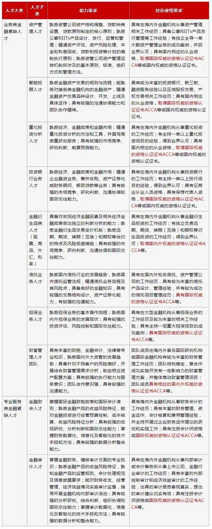 文件中明确指出,将取得国际权威的资格认证证书 - ACCA人才列入“业务类金融紧缺人才”、“专业服务类金融紧缺人才”两项人才大类,共计10项人才子类。