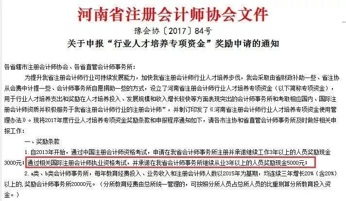 通过相关国际注册会计师(ACCA)执业资格考试,并承诺在省内会计师事务所继续从业 3 年以上的人员奖励现金 5000 元。