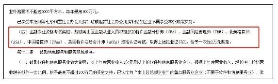 其中,关于金融持证人才奖励,对获得特许公认会计师(ACCA)资格证书,且在辖区同一家金融机构或金融专业服务机构从事相关专业工作连续三年以上的,给予3万元奖励。(落实单位:区金融局)