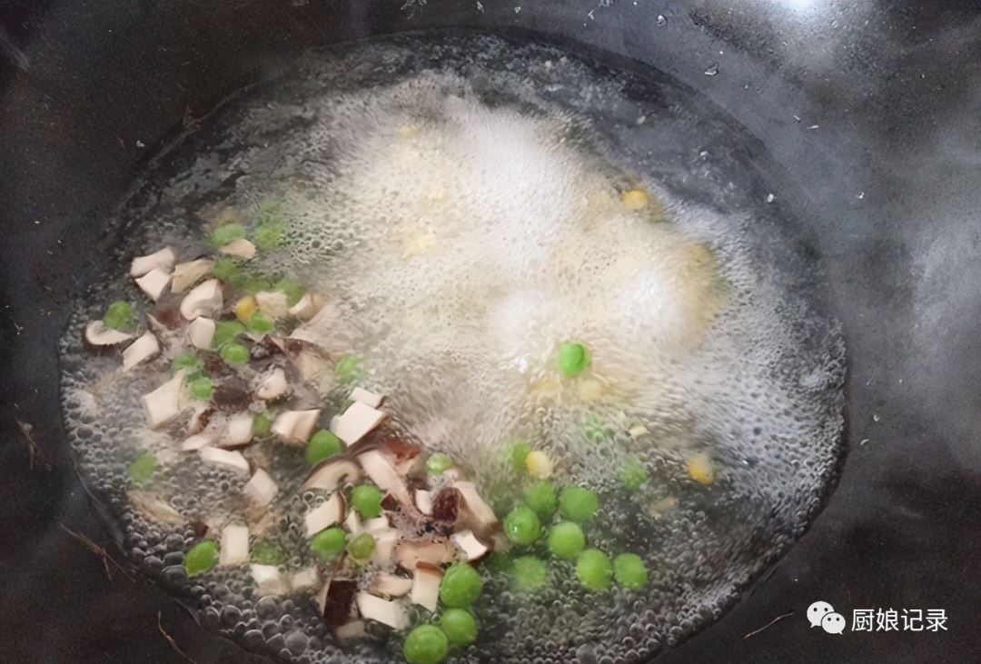 3、香菇切小丁和玉米、豌豆一起放入开水中焯水两分钟后捞出。