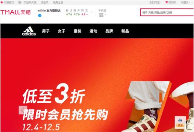 在搜索框里面去输入阿迪达斯,就会出现阿迪达斯旗舰店上面直接有着进店的选项,球迷在进店之后映入眼帘的是阿迪达斯旗舰店里各种不同的活动。在首页上方还有着搜索框,如果球迷你想要去购买女装男装或者是婴童之类的服饰,包括足球用品,都可以在搜索框里面搜索。