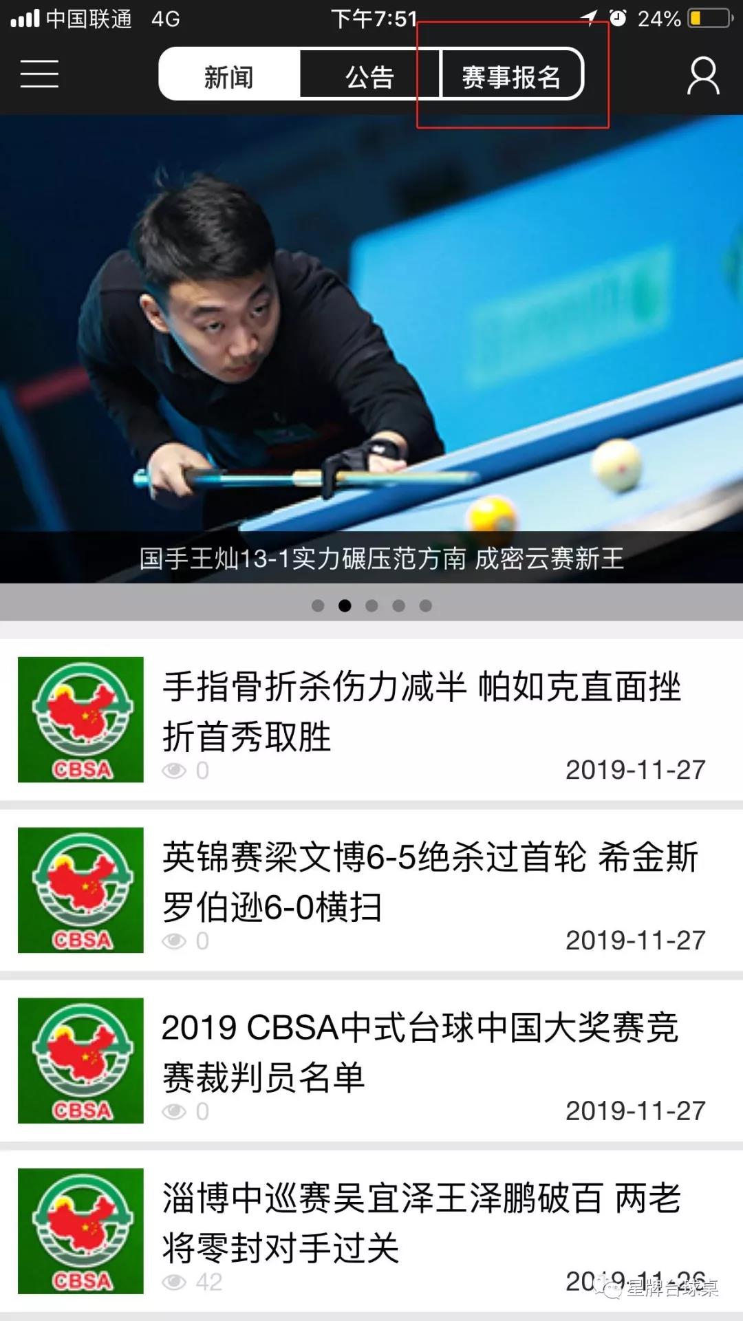 找到中国式台球中国公开赛,点击“我要报名”,弹出提醒信息后缴费,就可以报名胜利。