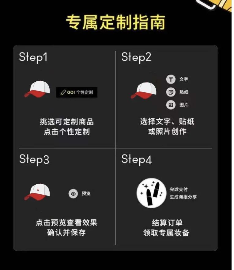 设计一个链接,简单的定制步骤,界面上有文字、贴纸、预览并保存这三个功能键。在微信推文内插入这个链接,参与者需要提交自己定制的鸭舌帽,并转发推文至朋友圈保留至活动当天。由此形成活动的宣传。如图所示