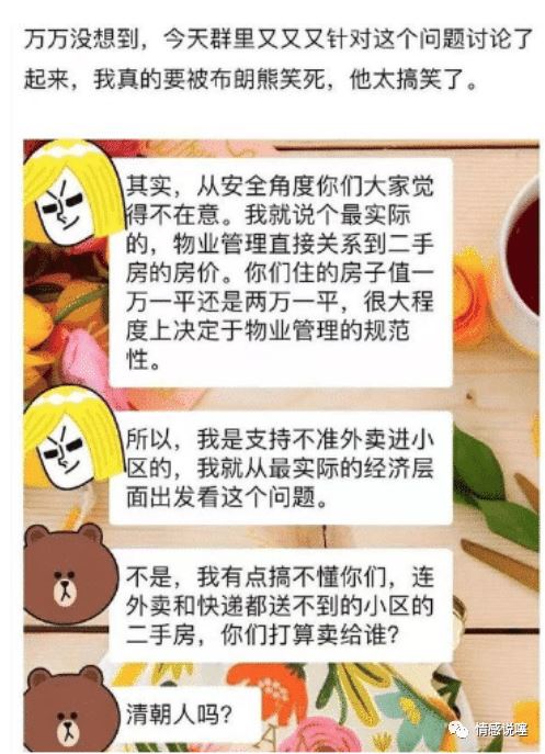 现在,有些地方小区有一些不成明的规定,就是为了业主的安全,居然不让快递员和外卖骑手进去自己的小区???如果非得拿外卖和快递,就去小区门口自己拿?哈哈哈哈,其实小编只想说,大家就是不想去拿,才点的外卖啊~ 有些小区特别大走到大门口都十几分钟了,那还不如直接出去吃呢~ 哈哈哈,看到下面这个布朗熊小哥说的话,我觉的特别的爽啊~哈哈哈就是这样啊,没错啊~