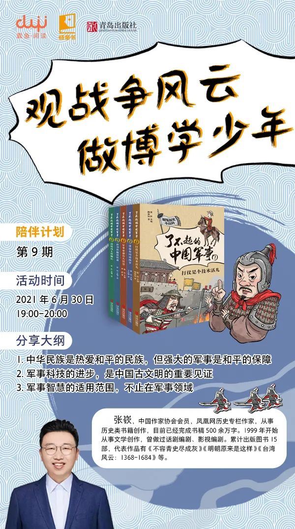 6月30日晚,在蠹鱼阅读、青岛出版社及各实体书店社群主办的“陪伴计划”2021年第9期直播分享会上,我们邀请到了作家张嵚老师,为全国120余个书店读者群的3万余名读者带来了“观战争风云,做博学少年 ”主题分享。就让我们一起聆听张老师关于军事史的基本知识,以及少年如何更好的走进和理解军事史的经验思考。