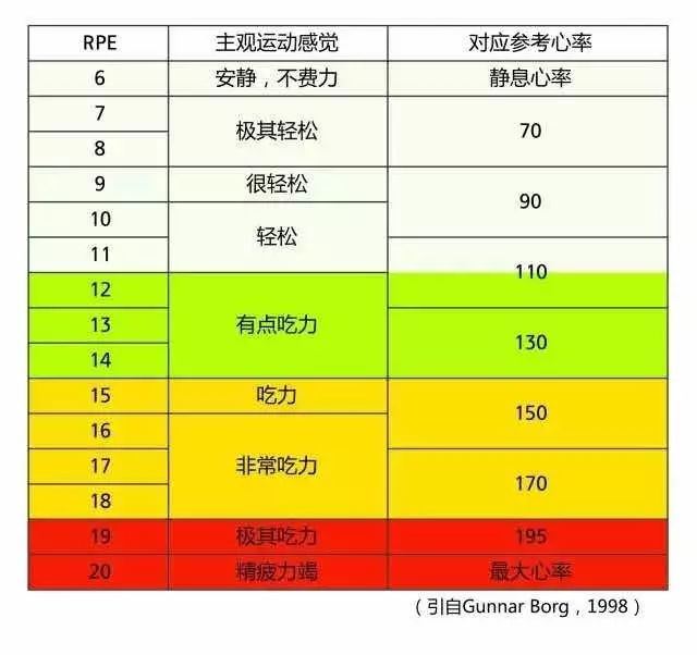 瑞典生理心理学家加纳·博格在1970年创造了这个量表,针对成年人,把运动强度分了20个等级,在运动中,可以凭借自己的感觉来判断运动强度。