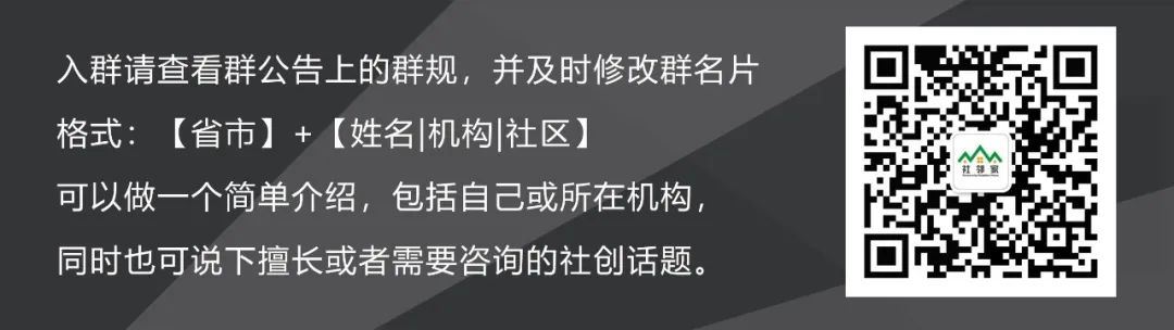 感谢大家一直以来关注社邻家,让我们了解到有那么多同道在社创路上一起披荆斩棘,为了让大家能够互相了解、相互助力,社邻家特此创建社区创行者交流群,让我们一起成为社创路上的同行者。