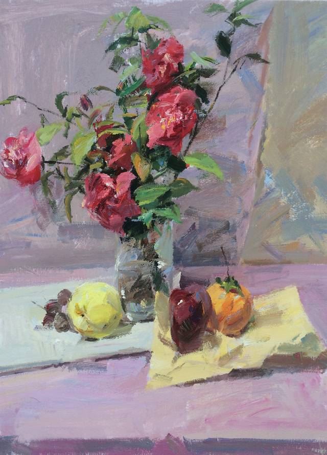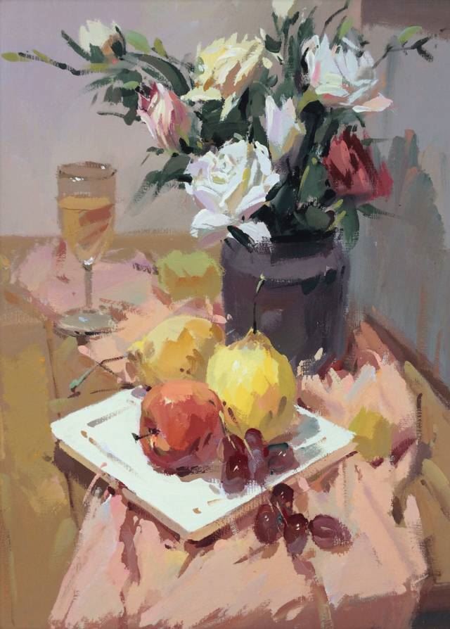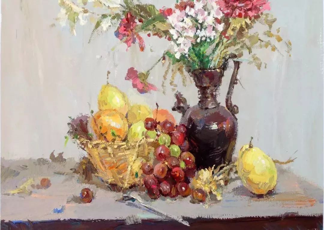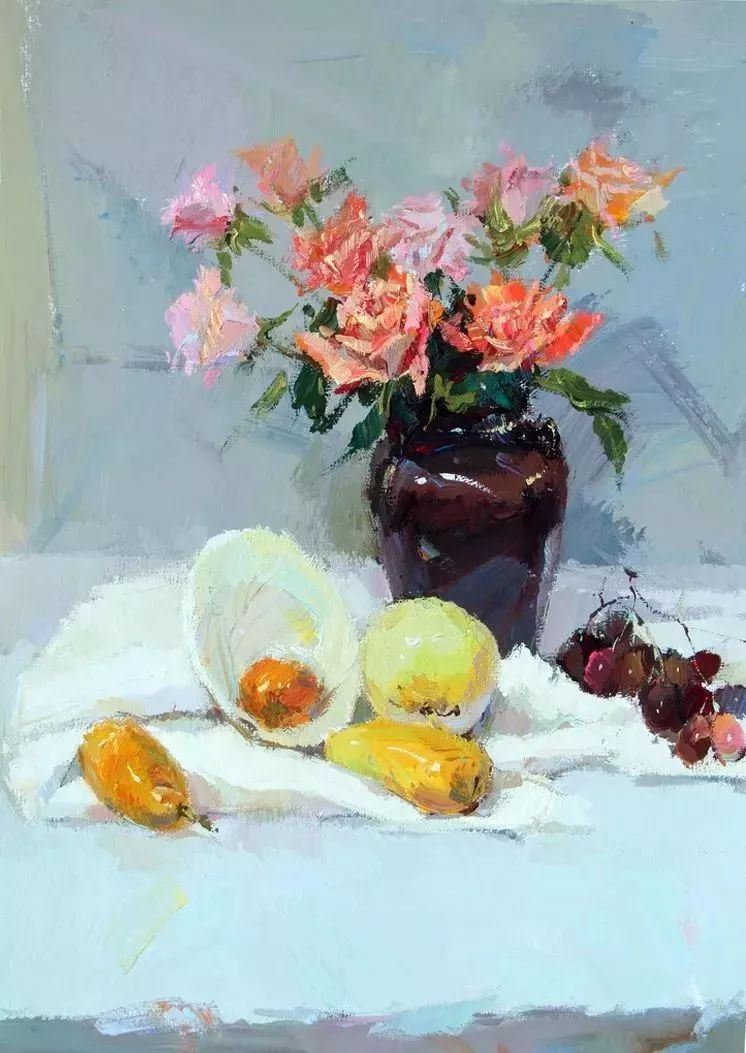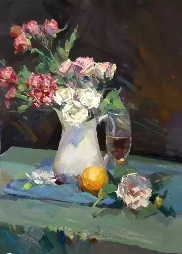 在画的过程中一定要注意造型美观,花瓶瓶口要小一些,瓶口要精细刻画,不要毛糙,这是体现花瓶厚度的重要环节,画时形要画准,在画时一定要注意颜色饱和,色调倾向性明确。颜色不要超过三种,环境色较少,大部分都是同类的灰色,稍微有一点色彩倾向。
