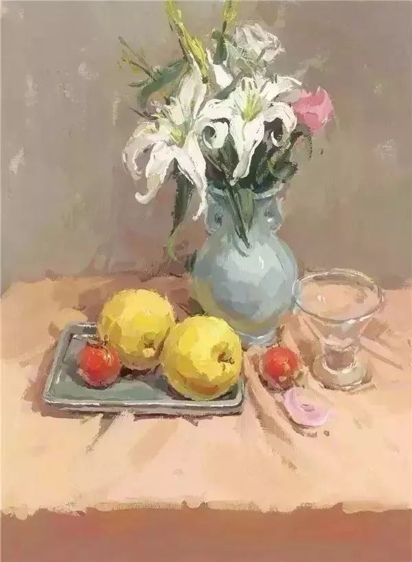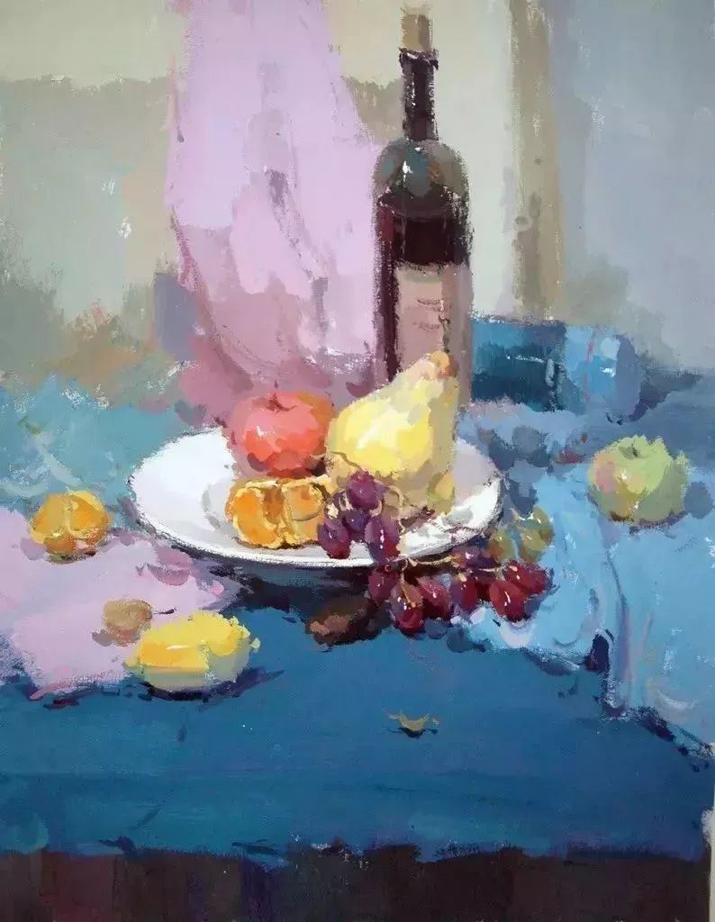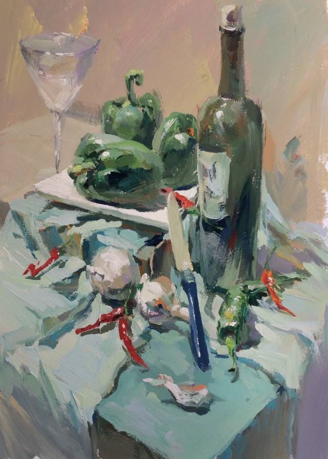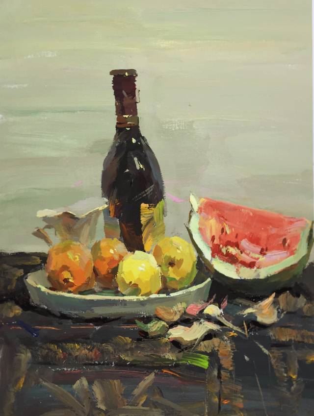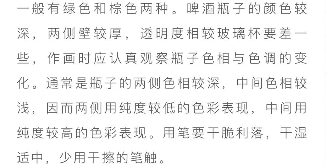 由小圆柱、圆锥和大圆柱组成。瓶子口部比较小,但也是需要精彩刻画的地方,可用小笔轻松表现,高光依附着肩部的变化,并不是很直的,可以略带点弧度,这样的表现更加生动。绿色的瓶身切记不要画得太“生”,可适当地加一些黄色,降低其纯度,融入画面的色调关系。