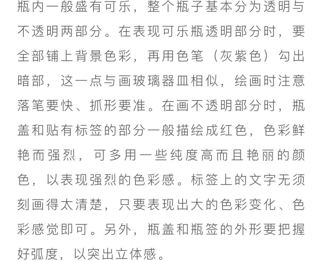 瓶口的面积虽小,但要表达出其口沿的厚度以及瓶口的深度。高光可带一点弧度,以增强其体积感。瓶体透明度部分的处理要掌握好其通透性,表示出瓶内中空间,并注意其边缘反光的融合。标签依附着瓶体的结构,特别是瓶体背面的标签,注意它们的透视关系。标签颜色不要太生硬,要能融入画面。