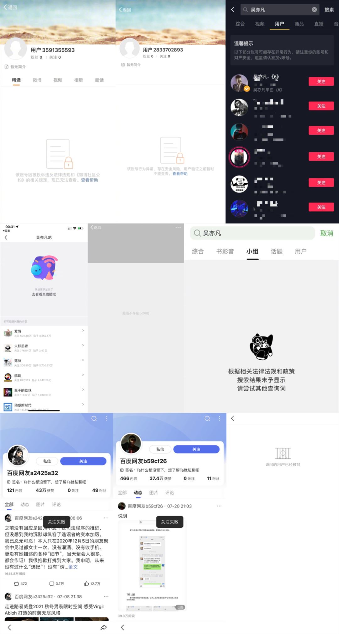 目前统计来看,微博、抖音、今日头条、百度百家号、微博超话、贴吧、爱奇艺、爱奇艺泡泡圈、腾讯视频、央视影音、豆瓣人物梅莉萨特里奥主页等等社交平台,吴亦凡相关的账号、聚集地都已经全部消失。