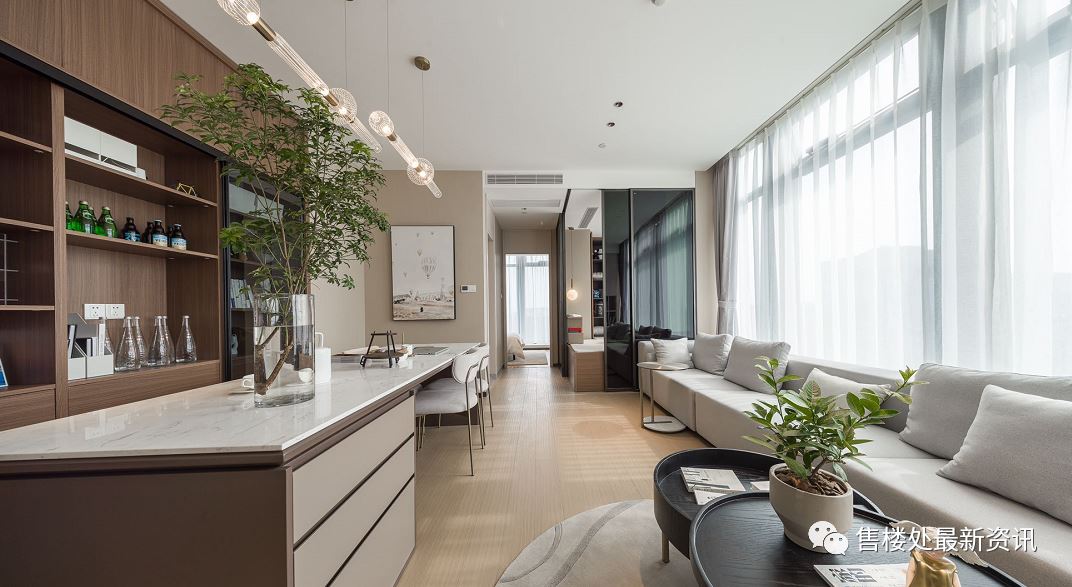 L型双面大落地窗高区瞰运河景观宽奢餐客厅一体空间