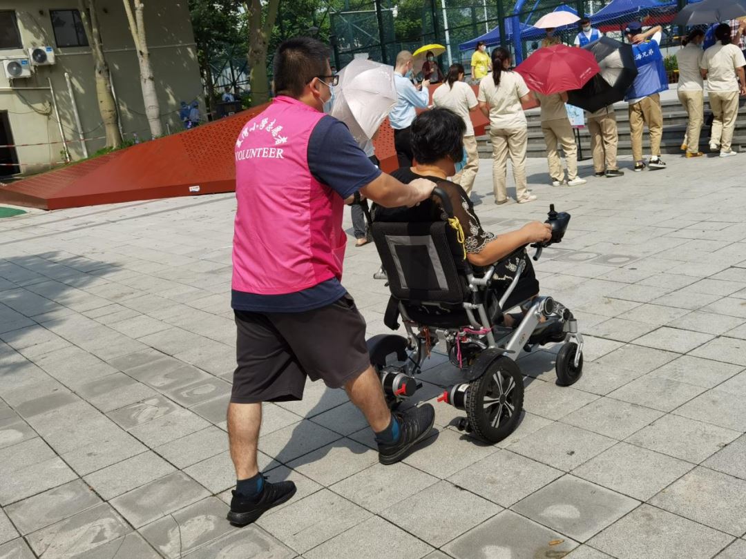 图|吴海武帮前来检测的老人推轮椅