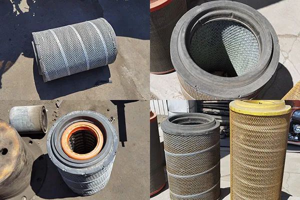 在维修厂的空地上,放着不少更换下来的空滤,其中不乏一些劣质的产品,它们不仅外芯表面布满了灰尘,内芯表面也有不少,这些空滤的过滤效果可想而知。