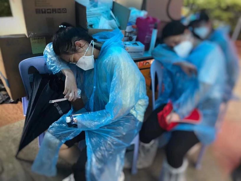 在经受早上烈日的烘烤后,大雨在午后袭来。官任社区检测点的志愿者们一边工作着,一边防着帐篷漏水,已经顾不上脚底湿鞋。