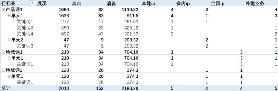 通过透视表,能够看到不同类型关键词的转化情况,以及业务ip来源。比如产品词里,外地业务的,基本上都是同一类产品带来的,这就是用户需求导致的。对这类产品词,会做降价,缩窄匹配进行处理,避免过多消费。