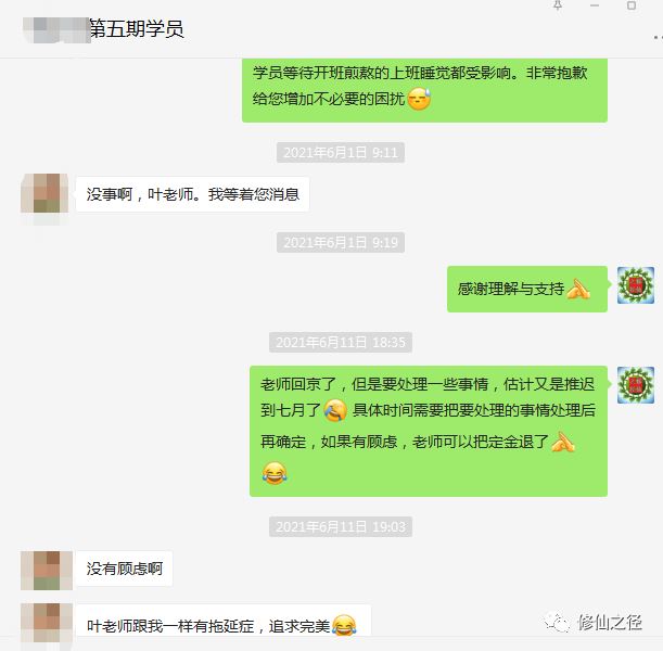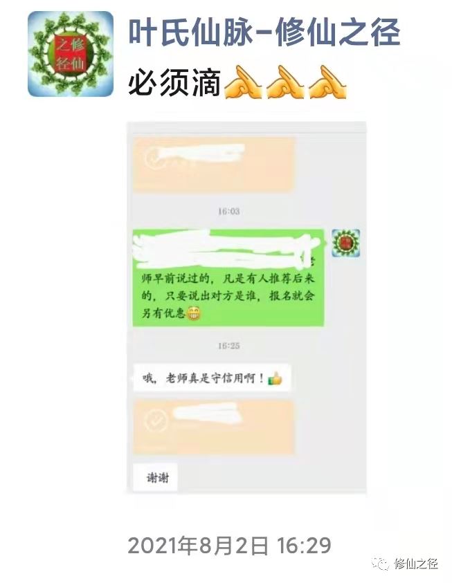 这位学员报名时没有告诉叶老师有人推荐过自己看老师的公众号,而是在课堂上讲到某事时叶老师提到自己的网友中有不少道长是很优秀的时候,该学员说自己就是一位道长推荐后才知道了叶老师的公众号,了解后认为叶老师的确有真货,不是骗子之类的,于是决定攒钱报名。故而叶老师给对方的相关优惠是在学习结束之后。)