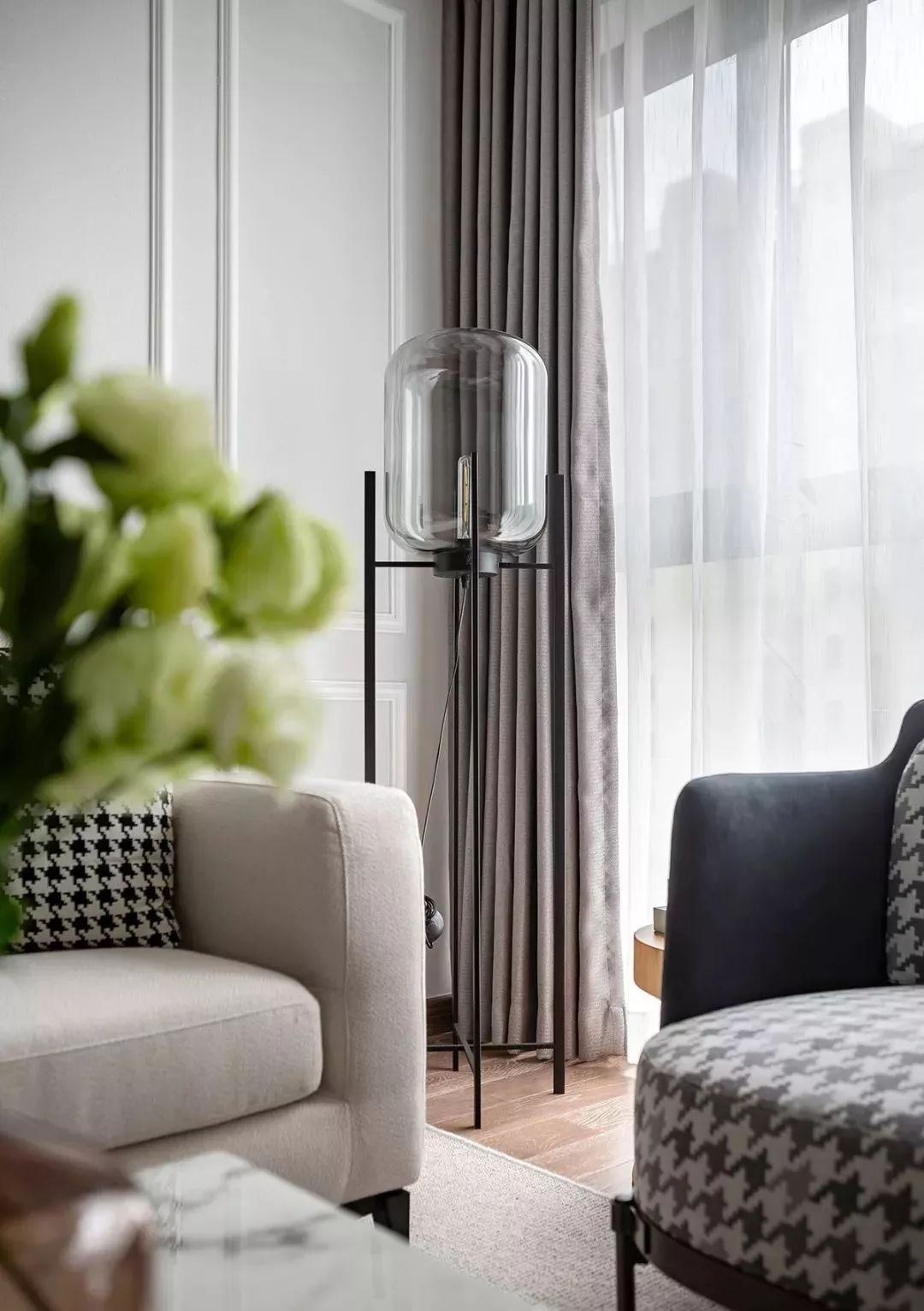 优雅的灰色背景加上简洁的线条装饰,护墙板的效果,让人感觉更加高雅有质感。浅咖色的一字型沙发,搭配千鸟格单人沙发和抱枕,通过姜黄色搭毯进行提亮,优雅舒适,灵动不单调。优美造型的水晶吊灯,就连灯座也是很唯美的,还有吊灯和落地灯,质感与设计感兼具。客厅与餐厅之间以背景和边柜进行区域的划分,木色背景与白色的边柜,加上艺术的摆件,形成一处不错的端景。