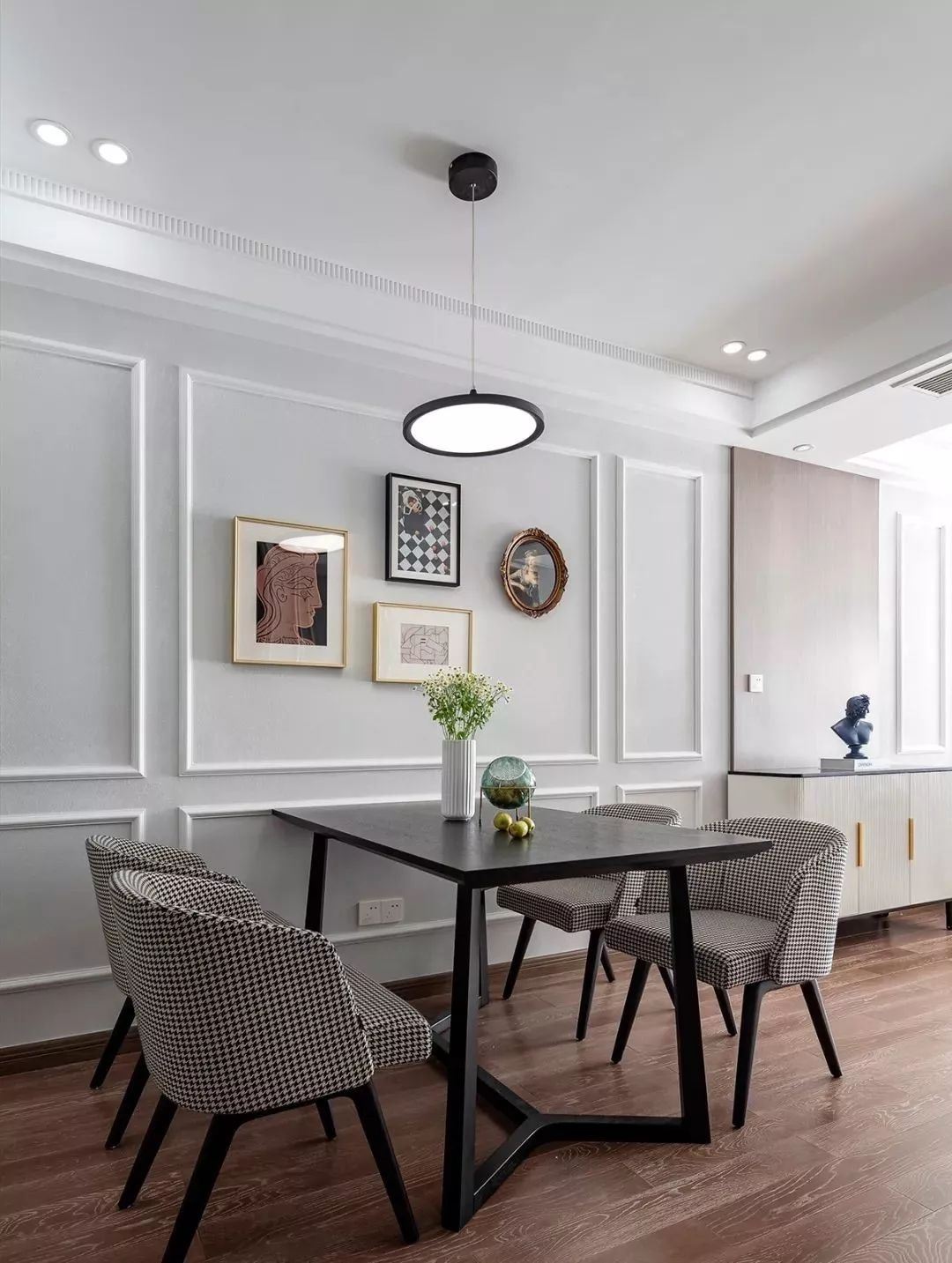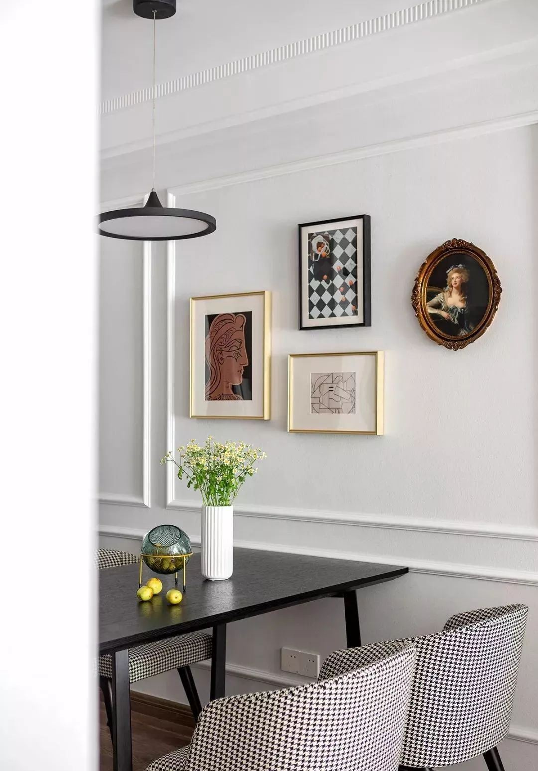 餐厅实木餐桌搭配墙面的防撞型PU线条、法式风情的装饰画组合既有当代设计的调性,亦有西方古典主义的浪漫与精致。