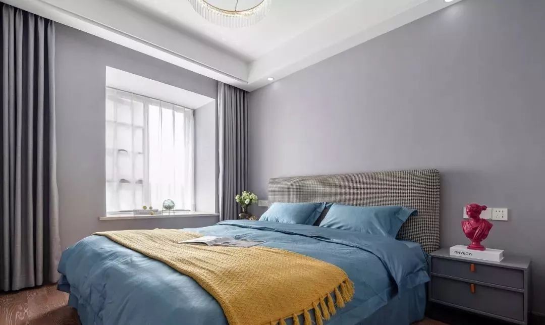 主卧室采用了安静沉稳的色彩,让生活更加简单,让家更加平和,让睡眠更加舒适。黄色的搭毯、床头的鲜花,是美好生活的一个调剂,给人以积极向上的力量。