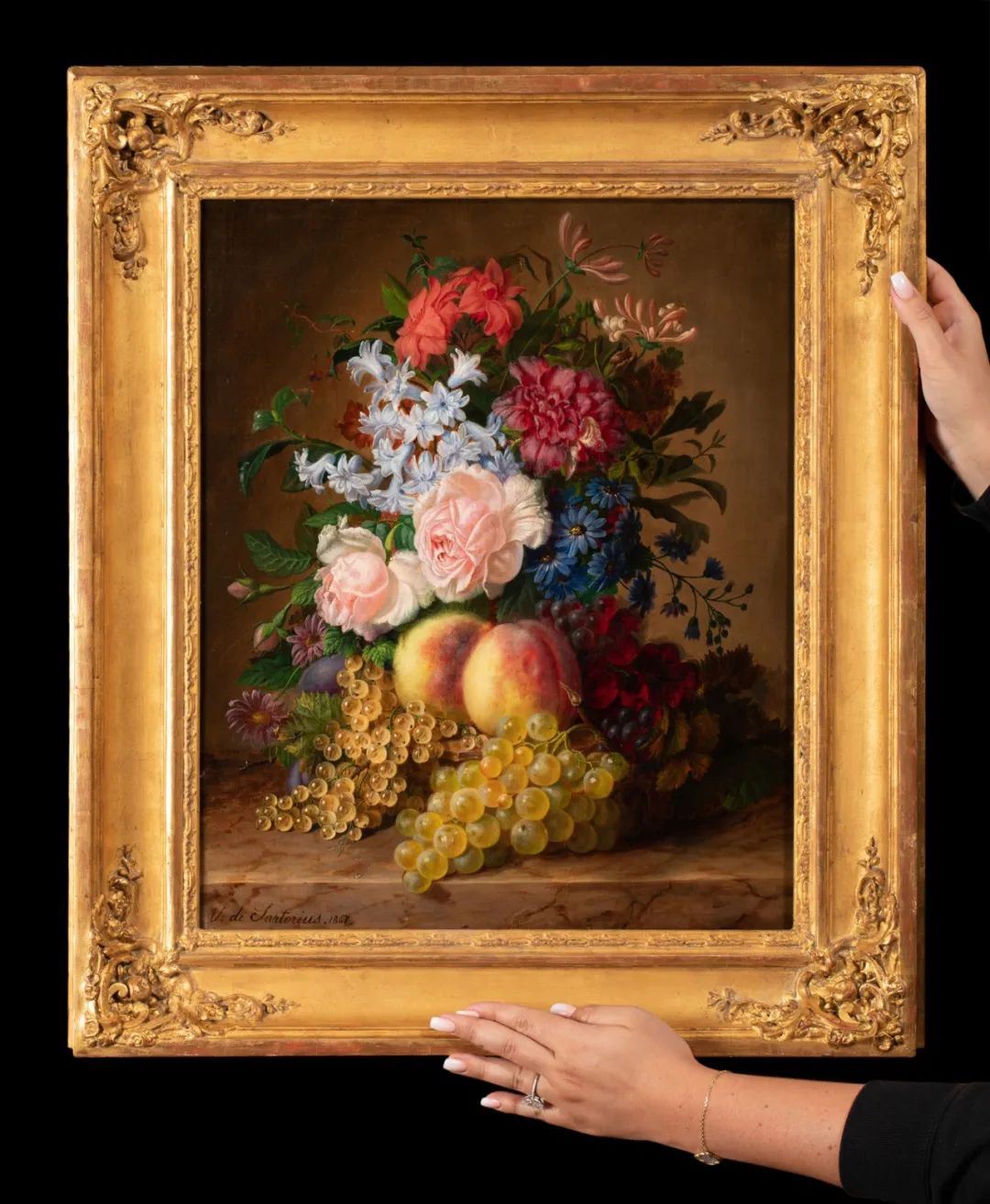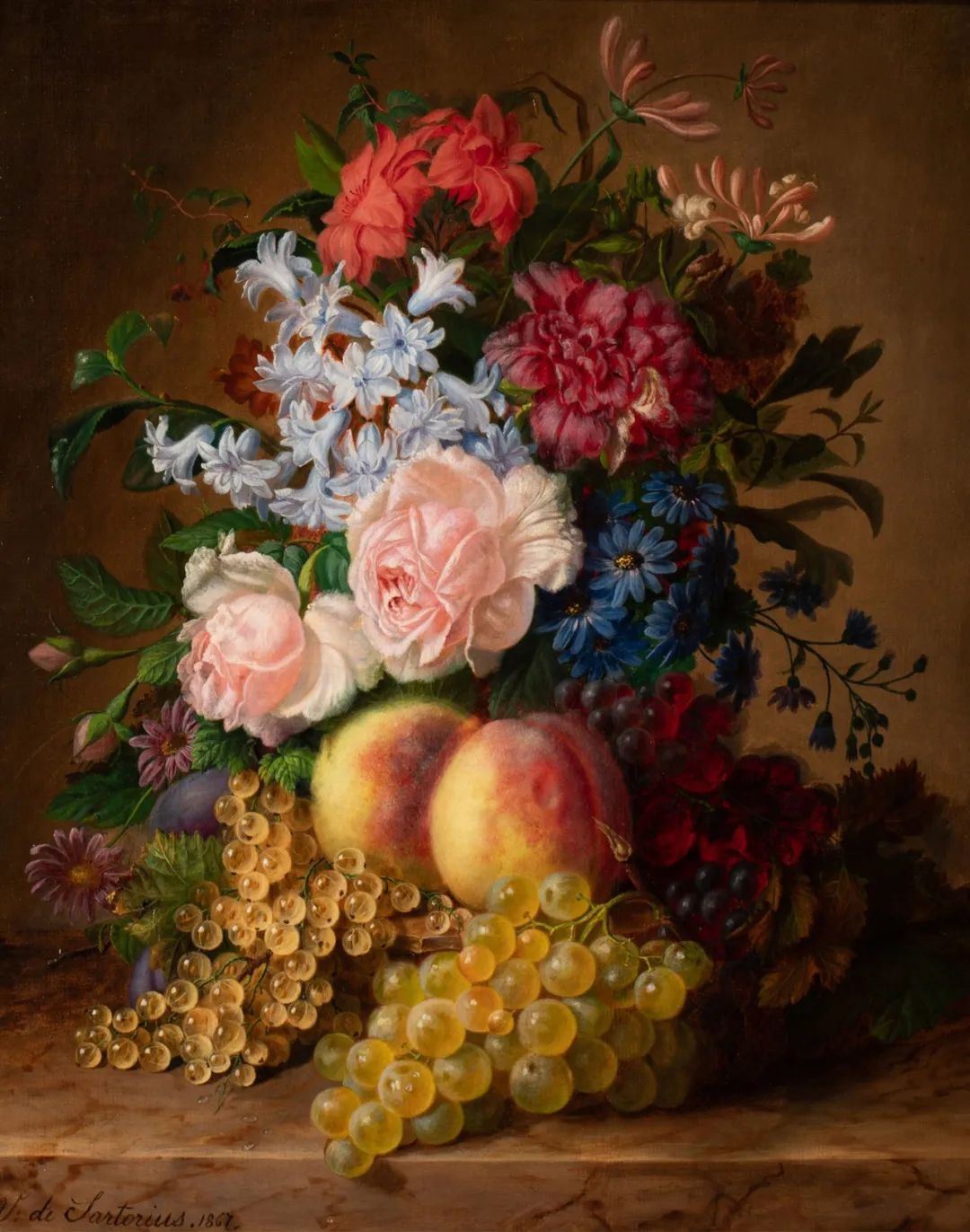1867年?利时女画家V. de Sartorius签名出品布?油画《花果静物》/独角鹿臻选Virginie在花果静物画上画艺过人,她的作品曾参展1852年安特惠普举办的皇家美术促进协会沙龙展、1855年巴黎国际博览会,以及1861年法国梅茨举办的沙龙展览,1872年,44岁的她仍在沙龙上展出作品。七分黑木耳Virginie de Sartorius的一生,几乎只留下与绘画有关的记录。除了各种展览,我们还知道,在1873年,她的一幅花卉绘画参展博览会,并且被利日市立博物馆(Musées Communal - Liège)收藏。1863年出版的《La noblesse artiste et lettrée: Tableau historique》中提到了出生于古老贵族家庭的Virginie de Sartorius小姐及她的作品。