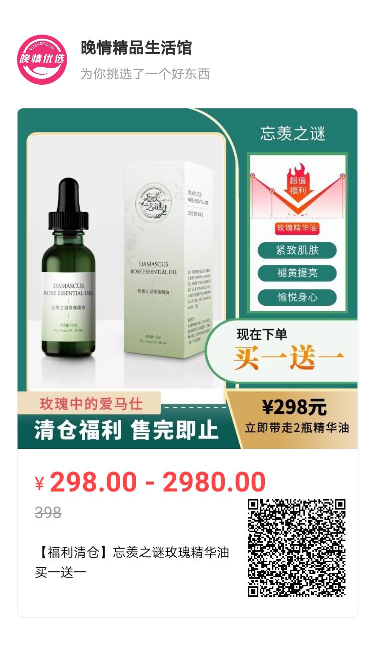 玫瑰精油限时买1送1,大家用着好可以再囤一些哦,现在非?;?,原价398元,现在298元买1送1,以后就没有这么大的优惠了。
