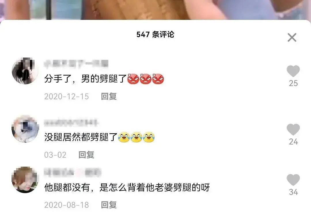 除了这些叫得上名的人以外,普通人的生活中“无腿男”劈腿的事儿也不少见的。