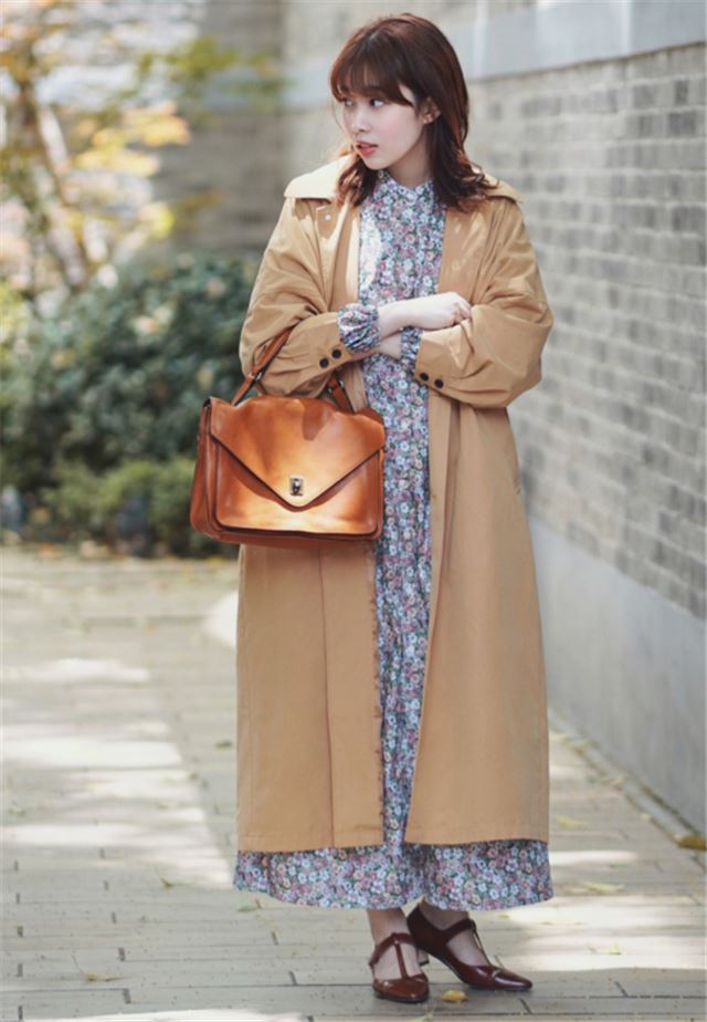 所以聪明的女性朋友们在选择风衣的时候,大多数都更喜欢选择一些具有设计感的内搭结合起来,纯色风衣和设计感超强的内搭就能够形成一定的对比,比如下面这种碎花连衣裙就具有一定的时尚感,花纹元素也可以丰富整个造型,和外面的纯色风衣可以有效地回应起来。