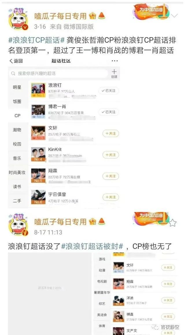 “浪浪钉”超话被关闭后,“俊哲”超话也被关闭了,“俊哲”是龚俊和张哲瀚影响力第二大的CP。其实,龚俊和张哲瀚还有很多CP名,网友已经替微博找好了,工作人员只需要一一关闭即可。这也从侧面说明:龚俊和张哲瀚确实是顶级流量。