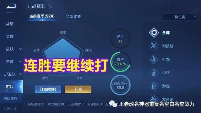 而且当你打出连胜以后那么就要继续打,千万不要害怕打得多会输,要知道有“安排”你输也就会有“安排”你赢酷宝影,这个时候千万不要害怕,见过有不少玩家连胜三四场就吓得不敢打,还怕接下来输了自己控制不住,然后就一直输,其实关于连胜有一个小妙招,那就是当你打出连胜后就继续打,等到输了一把以后就停止,不管是因为什么情况而输都不要继续了,直接打匹配或者娱乐模式,打到连败出现后再排位。