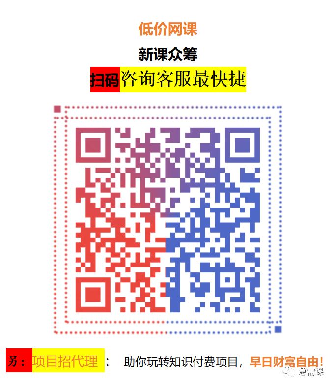 另“急需课”招网课代理25名,月入过万,有专属代理引流培训,各渠道引流都讲解,全程实操,8小时干货内容,日引50+精准粉。