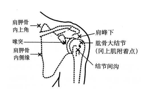 第二步,具有明显的肩部疼痛症状,压痛点明确,以肌肉附着点处明显,如肩峰下、冈上肌肱骨止点、喙突等,也常见于肩胛骨内上角、肩峰下等处(图 2)。