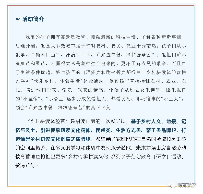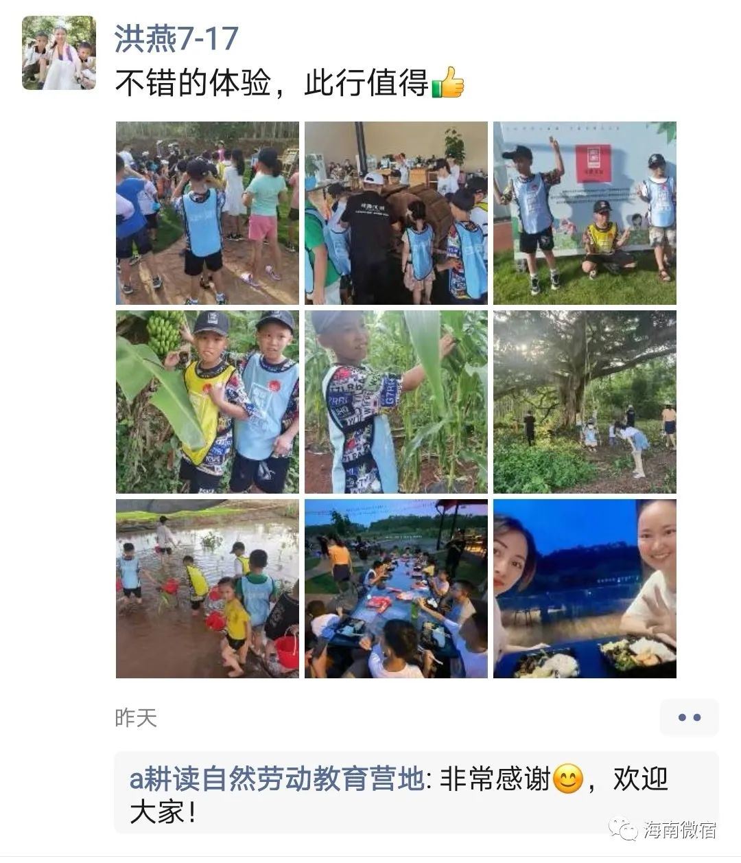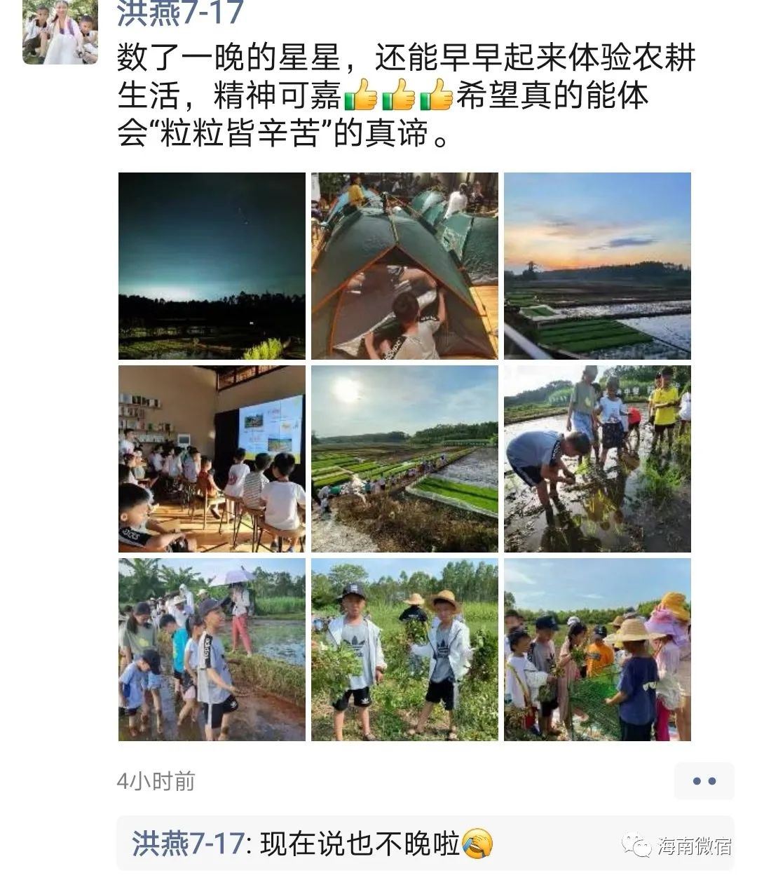 为期两天的暑期亲子乡村耕读体验营愉快地结束啦,耕读山房在这个过程中看到了孩子们的勇敢和智慧,感受到每个孩子为了获得、付出的努力。在活动结尾,耕读粒粒采访到了一位父亲,聊了聊参与的体验感受:这次活动把人带到自然里,还把书上硬邦邦的知识带到真实场景让孩子有真切感受,体验感很好。小孩子也挺让我惊喜,儿子平时在生活里是个小馋猫,但这次他获得、付出努力更多体验很自然及粒粒皆幸苦知识,在乡村,我发现他的自控力真的有蛮大进步。身处优越的条件,学会感恩、学会珍惜!耕读山房还在朋友圈里刷到了许多好评: