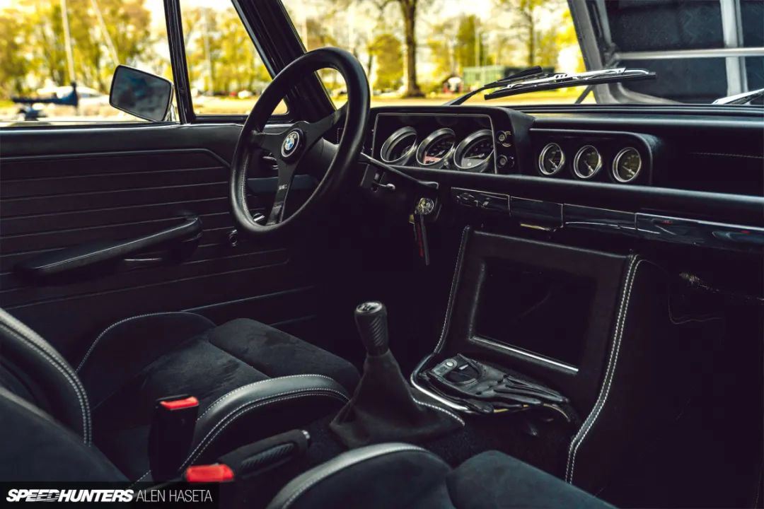 Magnus翻新了仪表板、门板和车顶黑色内衬,然后添加了Recaro BMW Performance座椅、BMW M安全带、AutoMeter仪表、改进E46 M3 OBP踏板、定制的脚垫和定制的经典Momo方向盘。