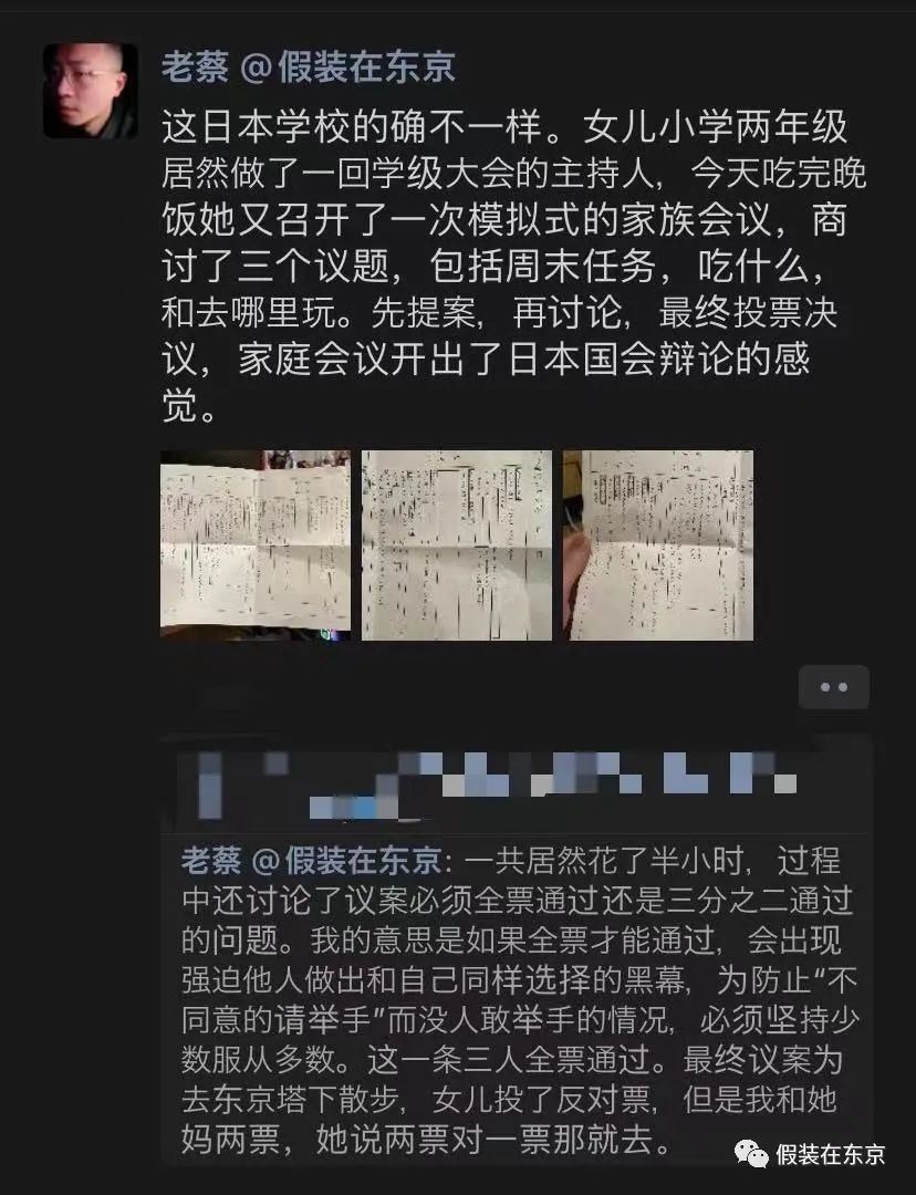我举手表示周末想去东京奥丹姆稀有蝎子塔下散散步,弟弟出生至今都没去过,我和蔡太太同意,但女儿不同意,2票对1票,通过。她虽然一开始并不想去(她只想去秋叶原买玩具),但过了几秒钟之后还是愉快的同意了,老父亲内心狂喜,这玩意儿效果简直拔群啊。(不过,几天后她又开了一次小会,最终把东京塔改成了渋谷,后来她每次遇到涉及全家的事情就要开会,差点就变开会狂魔了)