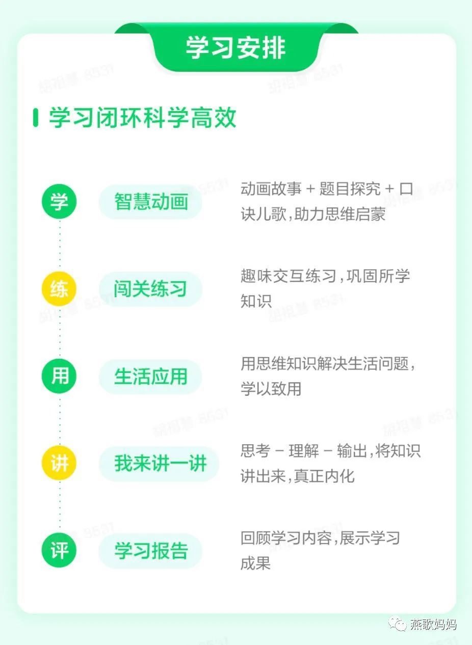 利用智慧动画、闯关练习、生活应用、我来讲一讲及学习报告,使课程学习完成“学+练+用+讲+评”闭环,让娃的进步看的见。