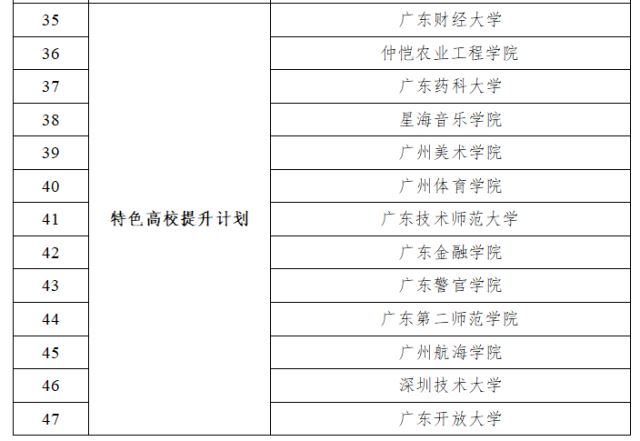 与上一轮相比,减少了4所高校。其中,广东医科大学、广东海洋大学“升舱”为高水平重点学科建设高校,广东药科大学云浮校区和广东技术师范大学河源校区均已开学启用。省教育厅有关负责人表示,粤东西北高校振兴计划建设高校以“补短板”为目标,着力补齐自身和区域高等教育短板,大力提升办学条件和师资队伍,打造一批支撑区域经济社会发展的重点学科专业。其中,到2025年,实现地市本科高校(校区)全覆盖及高质量建设,粤东粤西粤北地区高校办学条件进一步改善,新增2—3所高校达到硕士学位授权单位建设要求。建设国家级一流本科专业20个左右,省级一流本科专业90个左右,30个左右专业通过国内或国际权威组织专业认证。博士学位专任教师数占比进一步提高,生师比进一步下降,教师队伍整体水平进一步提升。全省有13所高校入选特色高校提升计划,与上一轮数量相比,减少1所。13所高校分别是广东财经大学、仲恺农业工程学院、广东药科大学、星海音乐学院、广州美术学院、广州体育学院、广东技术师范大学、广东金融学院、广东警官学院、广东第二师范学院、广州航海学院、深圳技术大学、广东开放大学。