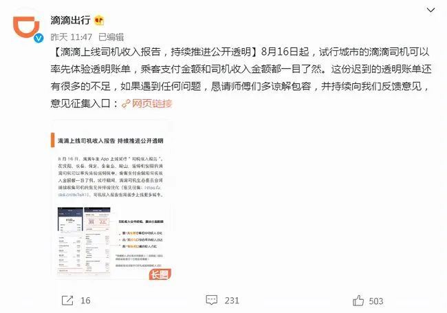 在本周一的时候滴滴在某社交平台上表示,将会上线滴滴司机的收入报告,透明账单,乘客支出多少,司机收入多少就一目了然。
