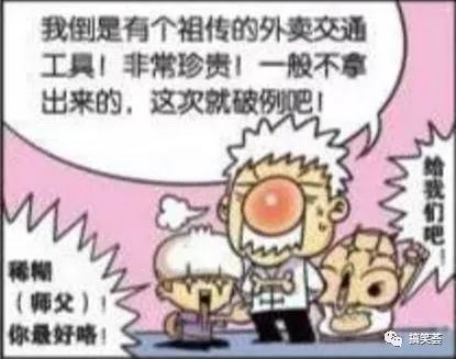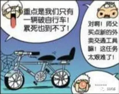 包子为难的说:“师父啊,看地图发现这次的外卖地点好偏僻,有好几千公里..........”老板鼓励他们说:“怎么了?这么快就打退堂鼓了,餐馆的信誉往哪儿放?”包子崩溃的说:“重点是我们只有一辆破自行车累死也到不了!”对啊,师父买点新的外卖交通工具嘛!这任务太艰难了!