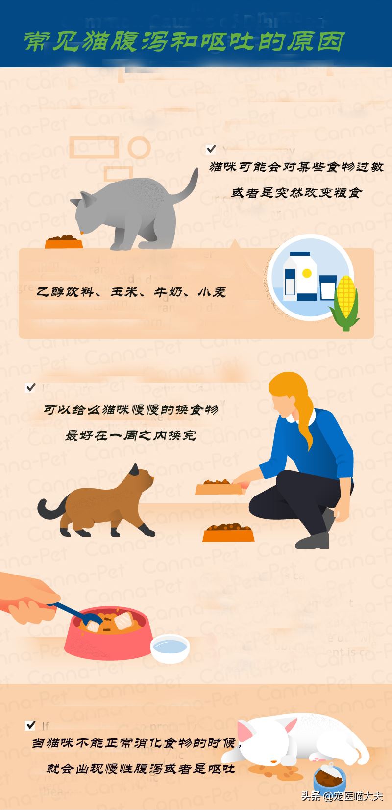 如果你突然改变你的饮食,猫的胃肠道会有刺激,从而, 它将导致猫的呕吐和腹泻; 另一种是猫可能无法忍受食物中的一些成分。例如, 乳制品, 小麦, 玉米或其他成分。