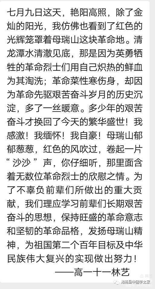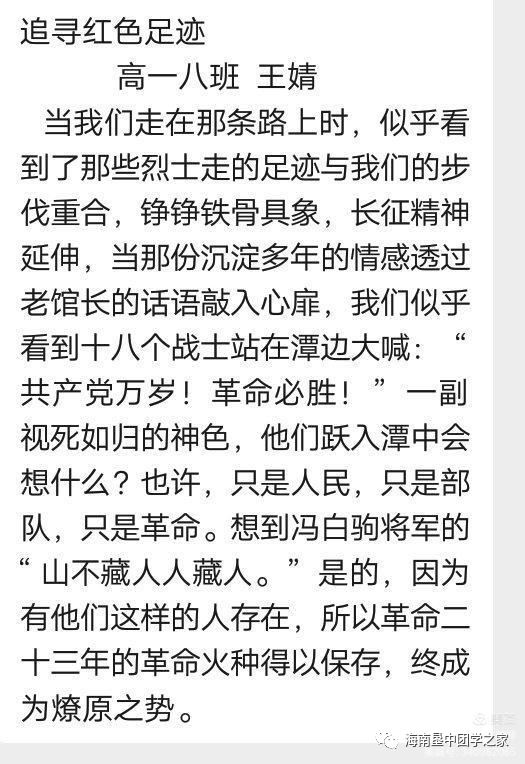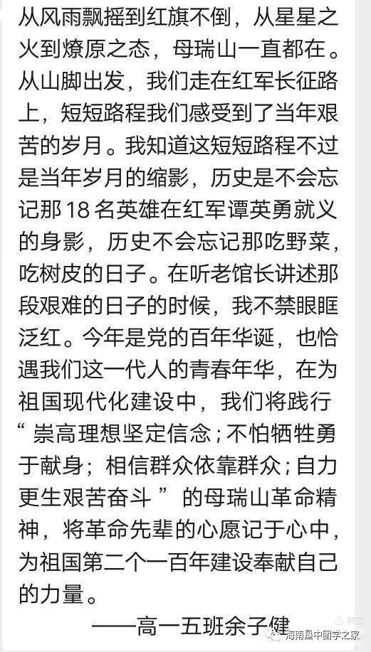 这次活动,我们走进了海南革命圣地,了解了家乡海南岛的革命往事,这让我们深切地体会到了革命的艰辛与不易,也让我们更加懂得珍惜今天的美好生活。我们定会接过红旗,将旗帜插上世界之巅,我们定会让所有人看到,中国之革命、中国之发展,是永远都不会停息的。
