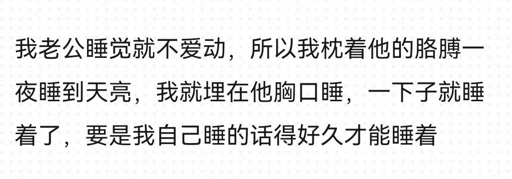 结婚以来就除了他上班值班以外,就没有分开睡,每次他在值班(可能半个月一次)我和孩子两个人睡,我在困一晚上都要醒来两三次。现在怀孕晚期了,虽然不做,有他在身边睡得安稳些。
